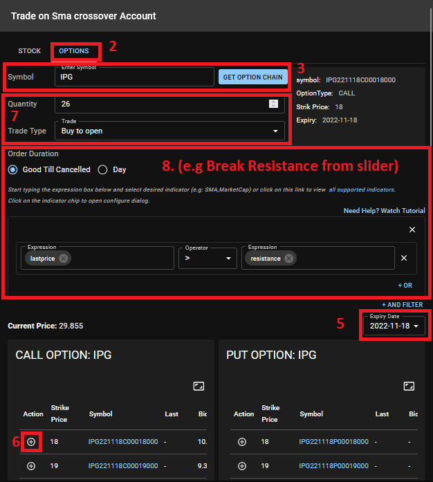 Automated option trades follow a similar process to stock trades, with a few additional steps to select the specific option contract.
